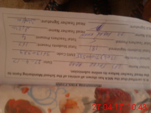 | Name: MIh**** UlMo**** Designation: (School Headmaster's/Headmistress's) PST HEAD. TEACHER Phone/Cell Number: 03**** |