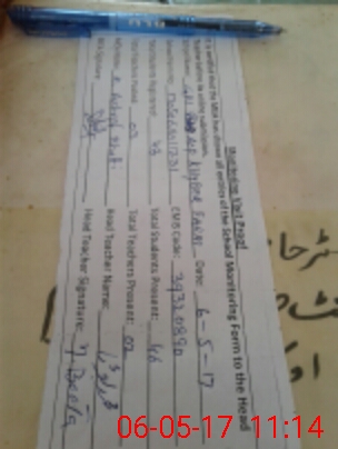 | School Visited by School Health & Nutrition Supervisor (No. of Visits) | 1 | Name1: | Masood U Rehman | Name2: | |