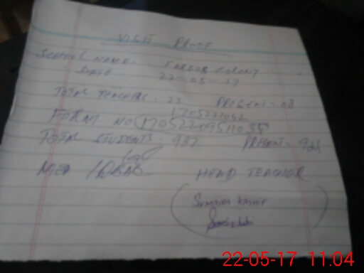 | Total no. of Classrooms: 15 No. of Classrooms Used for Teaching: 15 No. of Classrooms Storing Old Furniture, FTBs, etc: 0Comments if Any: 11 teachers on Census duty 01 teacher Earnd leave 01 teacher is Surrounded 01 teacher on Temporary duty NSB and FTF record Under process |