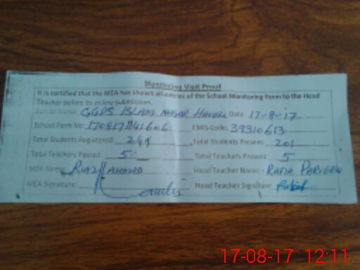| Attendance Register | Head Teacher | MEA with School | Visit Proof |