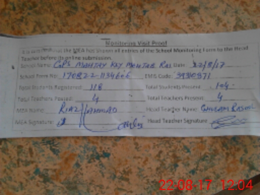 | Attendance Register | Head Teacher | MEA with School | Visit Proof |