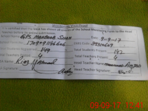 | Attendance Register | Head Teacher | MEA with School | Visit Proof |