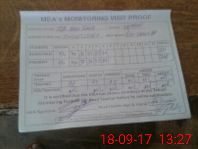 | Attendance Register | Head Teacher | MEA with School | Visit Proof |
