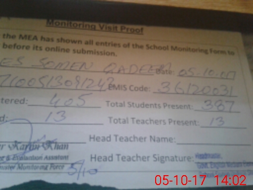 | Attendance Register | Head Teacher | MEA with School | Visit Proof |