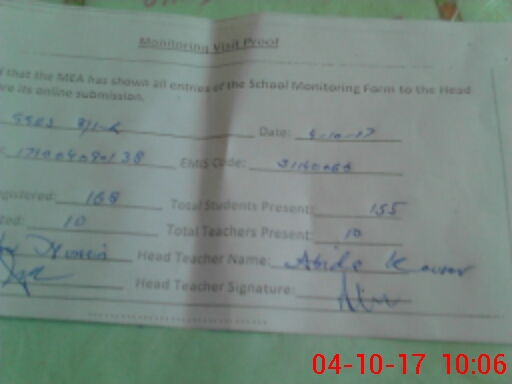 | Attendance Register | Head Teacher | MEA with School | Visit Proof |