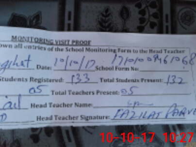 | School Visited by School Health & Nutrition Supervisor (No. of Visits) | 1 | Name1: | Gohar Zaman | Name2: | |