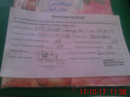 | EMIS Code: 36110234 | Name of School: GGPS ANSAR COLONY NO.1 MULTAN | |||
