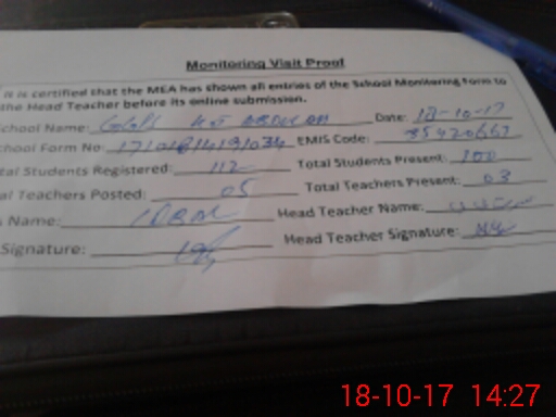 | Attendance Register | Head Teacher | MEA with School | Visit Proof |
