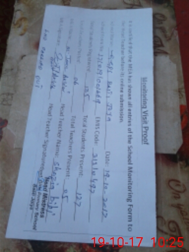 | School Visited by School Health & Nutrition Supervisor (No. of Visits) | 1 | Name1: | Shamshad Hussain | Name2: | Nil |