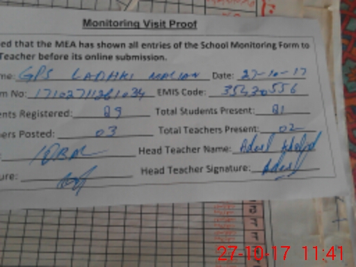 | Attendance Register | Head Teacher | MEA with School | Visit Proof |