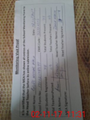 | Attendance Register | Head Teacher | MEA with School | Visit Proof |