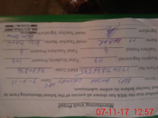 | Attendance Register | Head Teacher | MEA with School | Visit Proof |