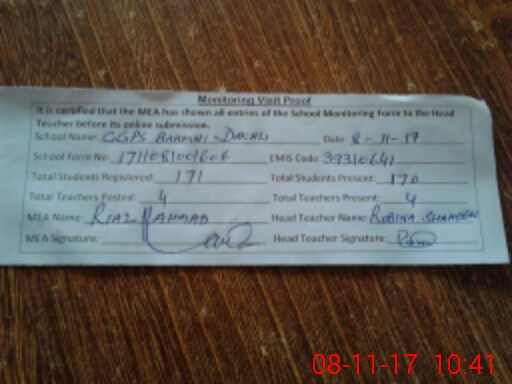| Attendance Register | Head Teacher | MEA with School | Visit Proof |