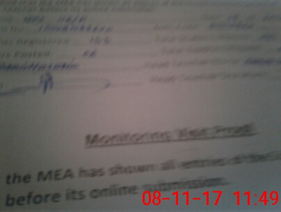 | Monitoring Date: 08-11-2017 | Start Time: 08-11-2017 10:43 AM | End Time: 08-11-2017 11:51 AM | Name of MEA: Za**** Hu**** | |