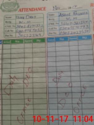 | CNIC | Full Name | Designation | R/C | Absence During Last Calender Month |