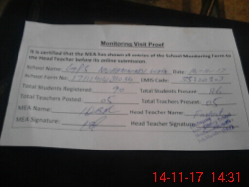 | Attendance Register | Head Teacher | MEA with School | Visit Proof |