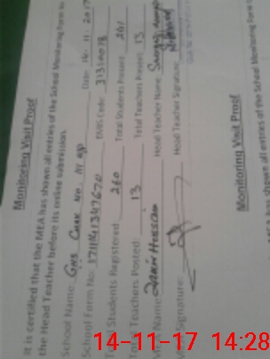 | Attendance Register | Head Teacher | MEA with School | Visit Proof |