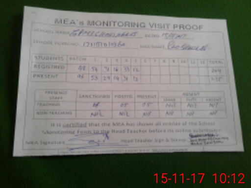 | Attendance Register | Head Teacher | MEA with School | Visit Proof |
