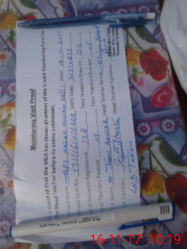 | School Visited by School Health & Nutrition Supervisor (No. of Visits) | 1 | Name1: | Sabir Hussain | Name2: | Nil |