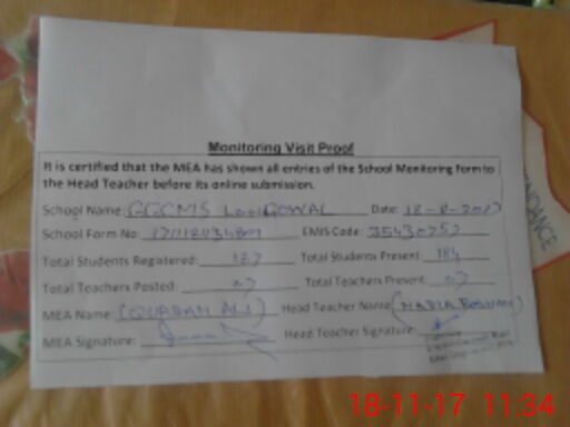 | Attendance Register | Head Teacher | MEA with School | Visit Proof |