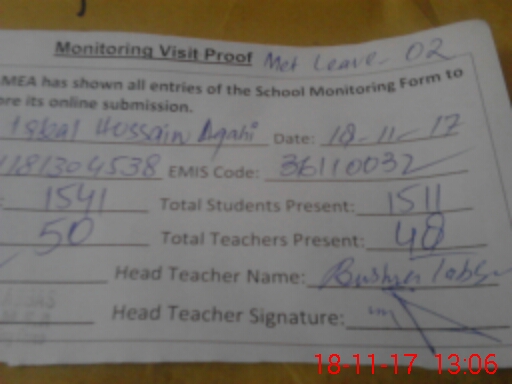 | Attendance Register | Head Teacher | MEA with School | Visit Proof |