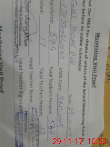 | EMIS Code: 36120005 | Name of School: GHS TODAR PUR BASTI CHUJJU SHAH SHUJABAD | |||