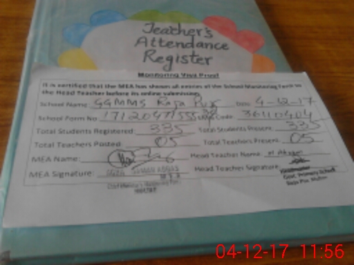 | Attendance Register | Head Teacher | MEA with School | Visit Proof |
