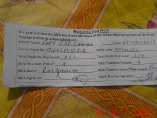 | Attendance Register | Head Teacher | MEA with School | Visit Proof |