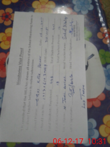 | School Visited by School Health & Nutrition Supervisor (No. of Visits) | 1 | Name1: | Shamshad Hussain | Name2: | Nil |