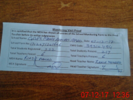 | Attendance Register | Head Teacher | MEA with School | Visit Proof |