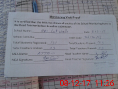 | Attendance Register | Head Teacher | MEA with School | Visit Proof |