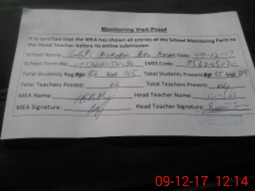 | Attendance Register | Head Teacher | MEA with School | Visit Proof |