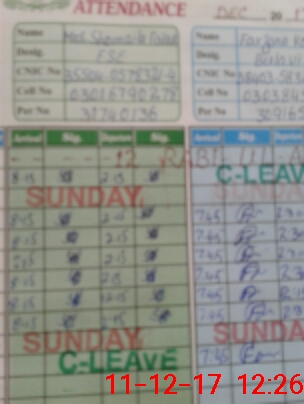| CNIC | Full Name | Designation | R/C | Absence During Last Calender Month |
