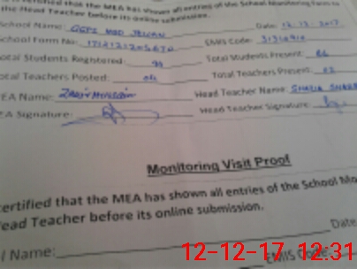 | Attendance Register | Head Teacher | MEA with School | Visit Proof |