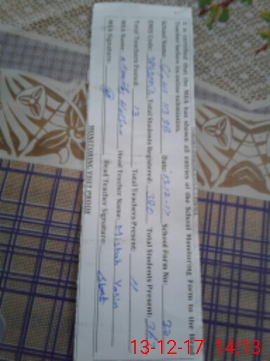 | School Visited by School Health & Nutrition Supervisor (No. of Visits) | 1 | Name1: | Tahir Mehmood | Name2: | |
