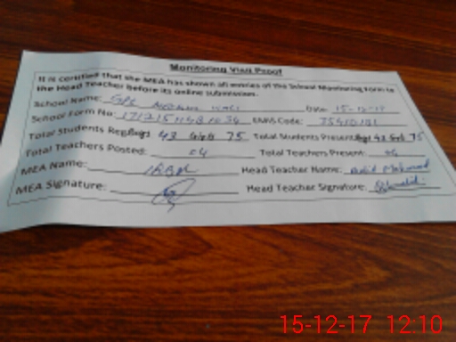 | Attendance Register | Head Teacher | MEA with School | Visit Proof |