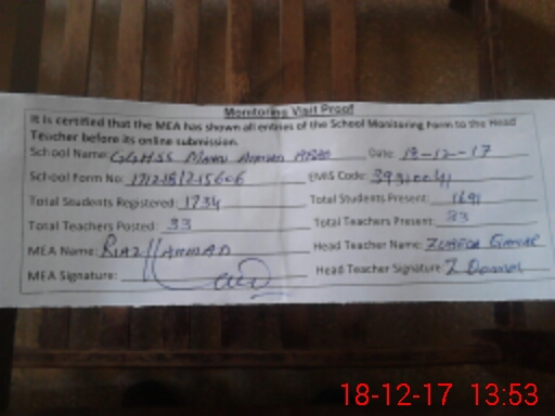 | Attendance Register | Head Teacher | MEA with School | Visit Proof |