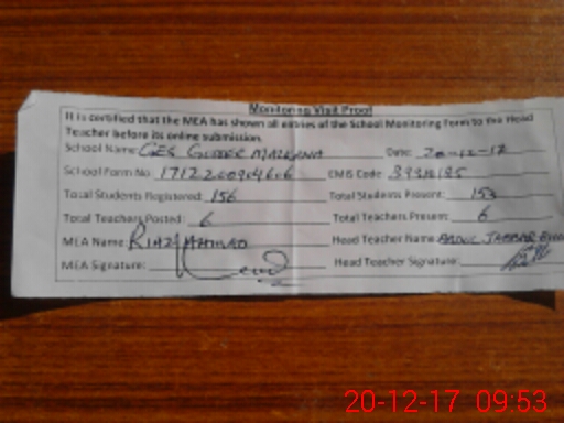 | Attendance Register | Head Teacher | MEA with School | Visit Proof |