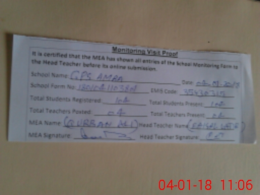 | Attendance Register | Head Teacher | MEA with School | Visit Proof |