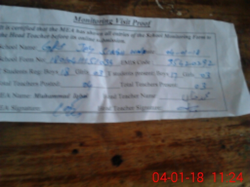 | Total no. of Classrooms: 1 No. of Classrooms Used for Teaching: 1 No. of Classrooms Storing Old Furniture, FTBs, etc: 0Comments if Any: FTF not charged Teacher Furqan on Additional duty at GPS Rakh chouni w e f 23 09 2017 for for order By order DDEO MDK |