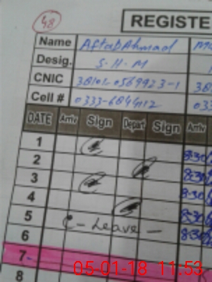| CNIC | Full Name | Designation | R/C | Absence During Last Calender Month |