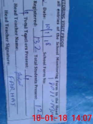 | School Visited by School Health & Nutrition Supervisor (No. of Visits) | 1 | Name1: | M Hasnain | Name2: | |