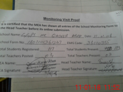 | Attendance Register | Head Teacher | MEA with School | Visit Proof |