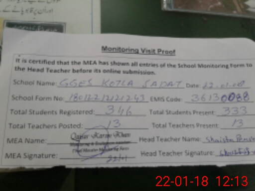 | EMIS Code: 36130088 | Name of School: GGES KOTLA SADAT NEAR SADIQ ABAD MULTAN | |||