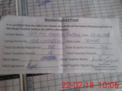 | Attendance Register | Head Teacher | MEA with School | Visit Proof |