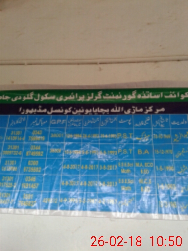 | Total no. of Classrooms: 2 No. of Classrooms Used for Teaching: 1 No. of Classrooms Storing Old Furniture, FTBs, etc: 0Comments if Any: One class room is without roof as shown dangerous Its Condition is required to declared by SDO building through department |