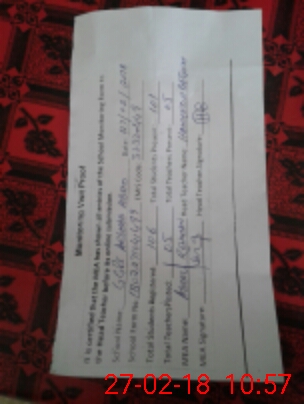| School Visited by School Health & Nutrition Supervisor (No. of Visits) | 1 | Name1: | GHULAM MUSTAFA | Name2: | Nil |
