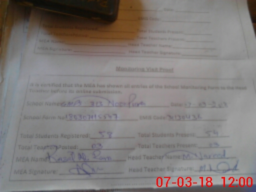 | Attendance Register | Head Teacher | MEA with School | Visit Proof |