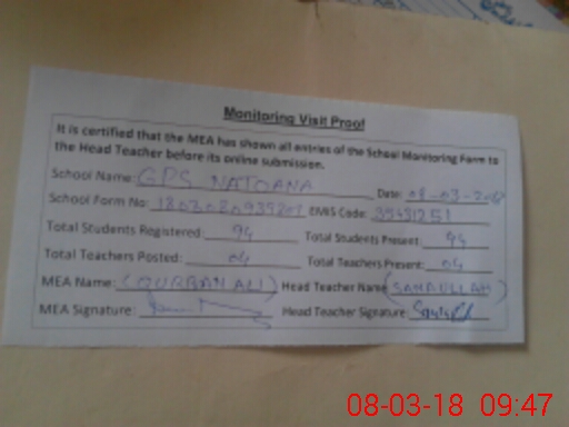 | Attendance Register | Head Teacher | MEA with School | Visit Proof |