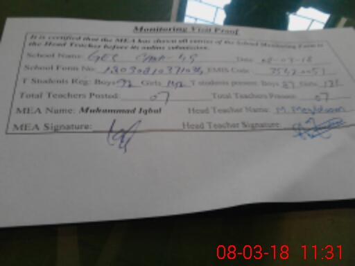 | Attendance Register | Head Teacher | MEA with School | Visit Proof |